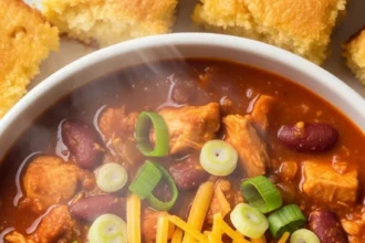 Warm up with a hearty bowl of buffalo chicken chili topped with cheese, perfect for game day or a cozy…